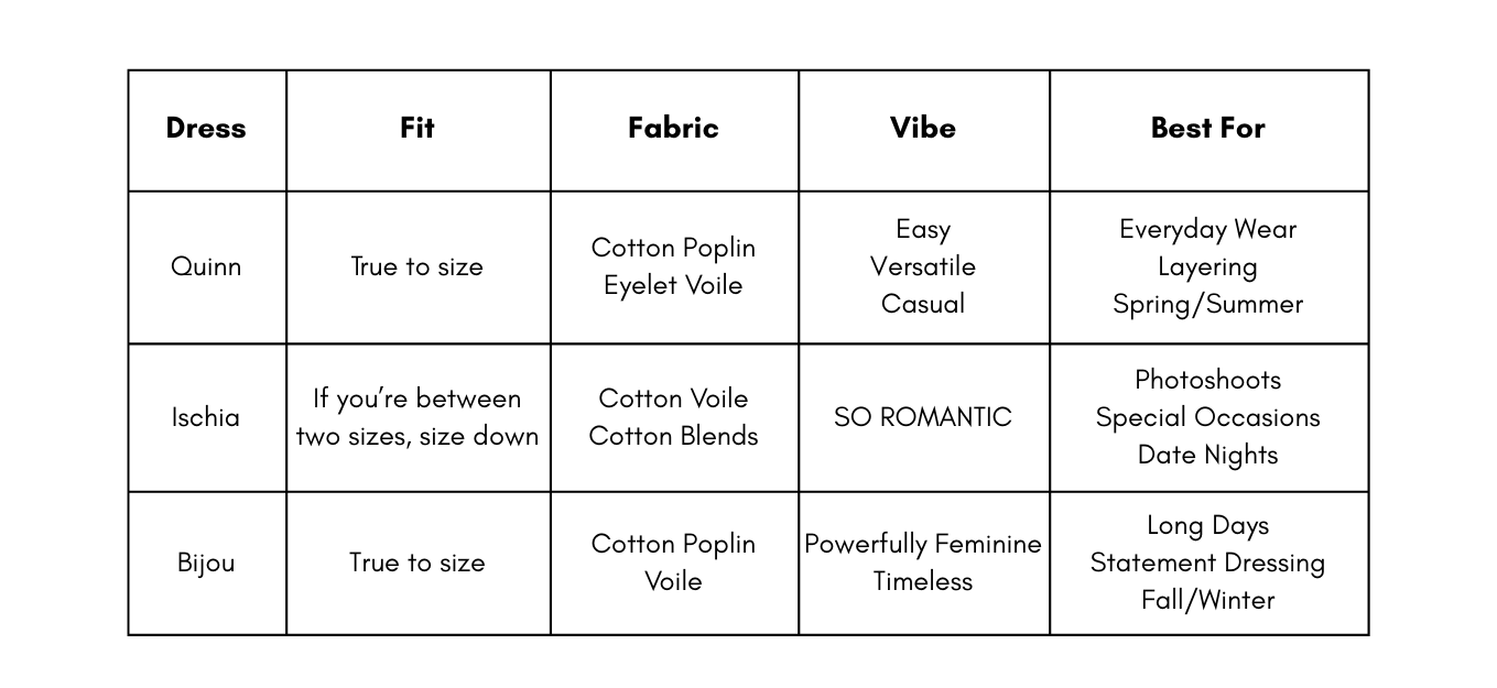 Quinn vs Ischia vs Bijou: A DÔEN Dress Comparison & Fit Guide