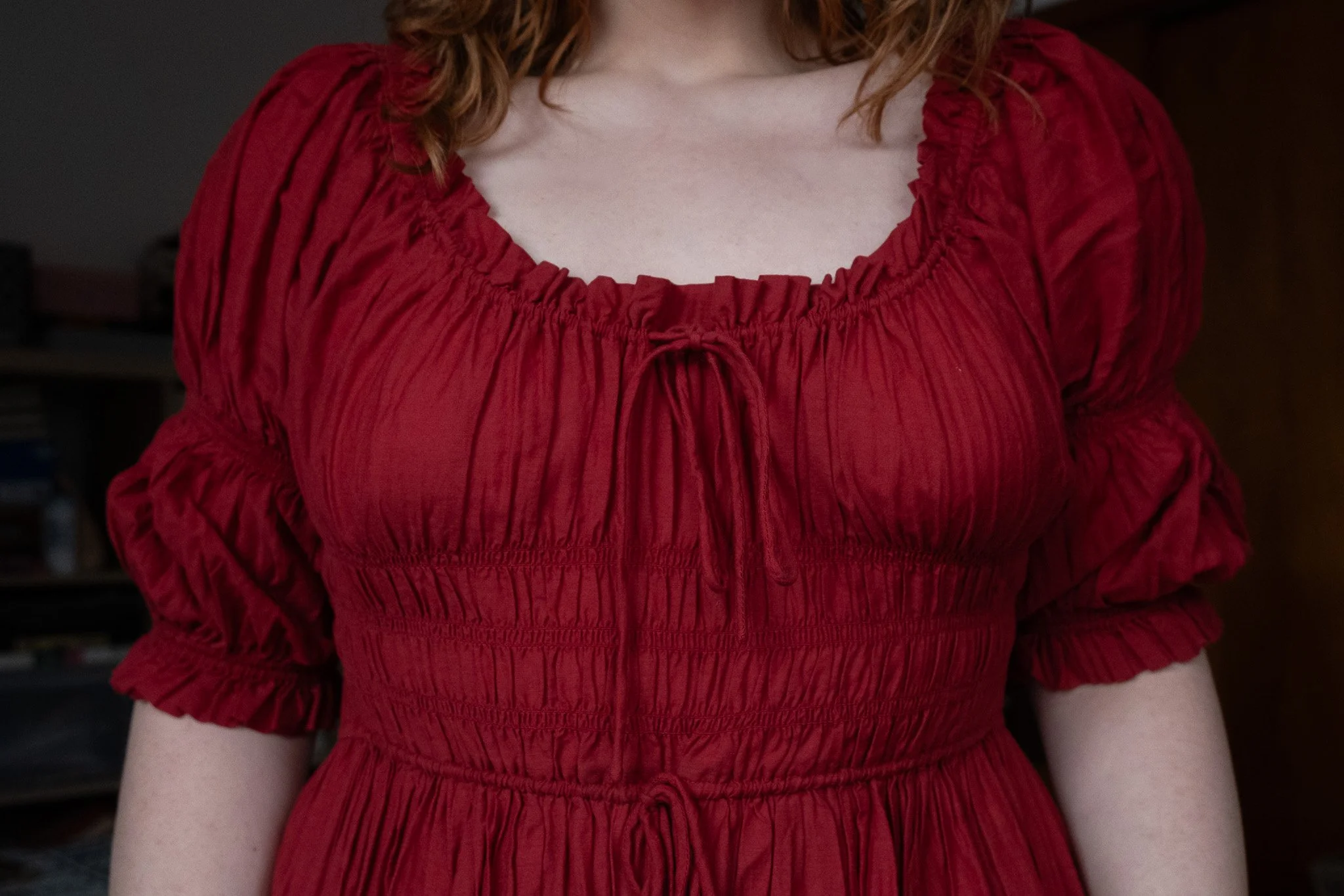 The elasticized smocking through the bodice offers structure without feeling restrictive, and will adapt to normal body fluctuations - which is always a plus for me! The midi-length A-line skirt is especially flattering if you have fuller hips - it skims instead of clinging, creating beautiful movement.